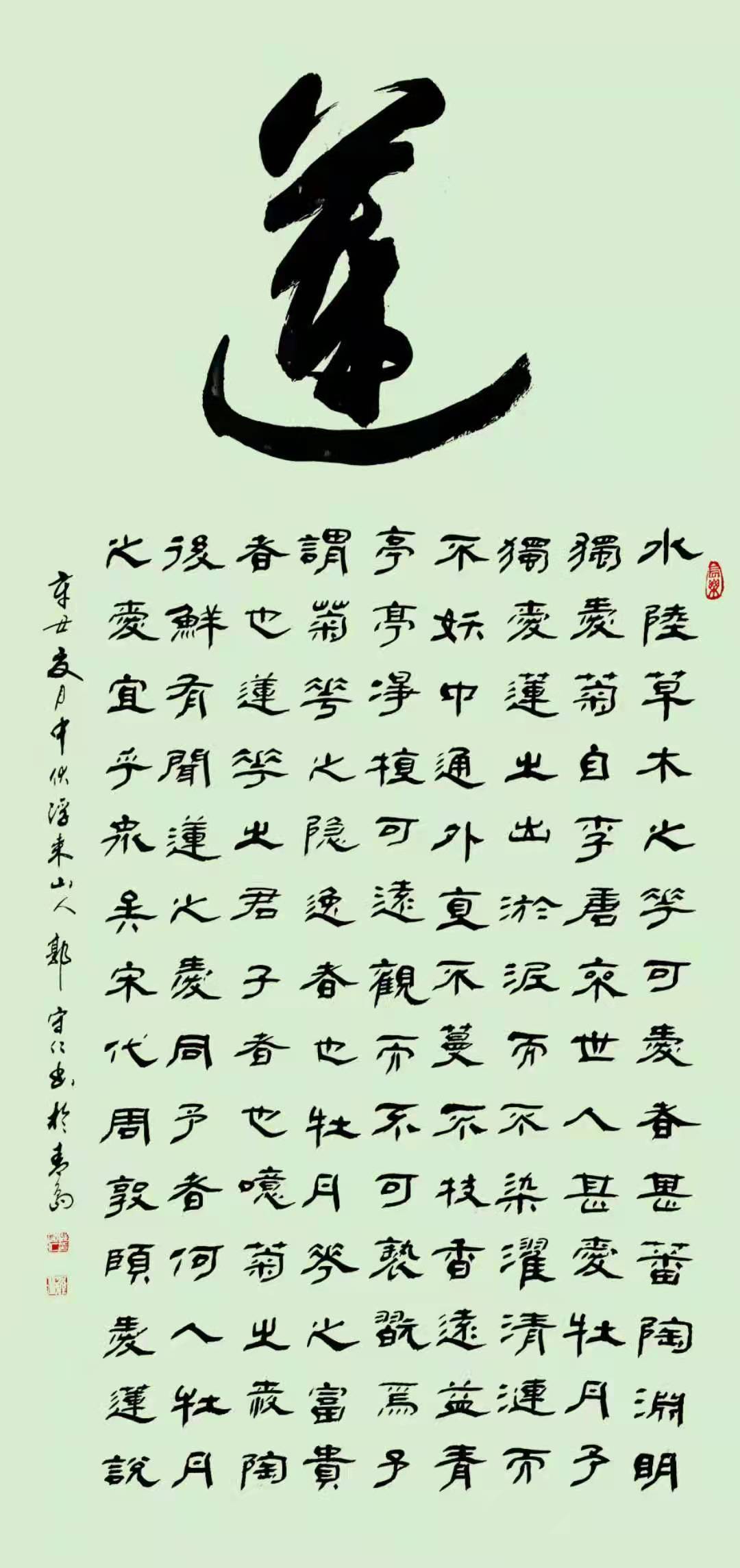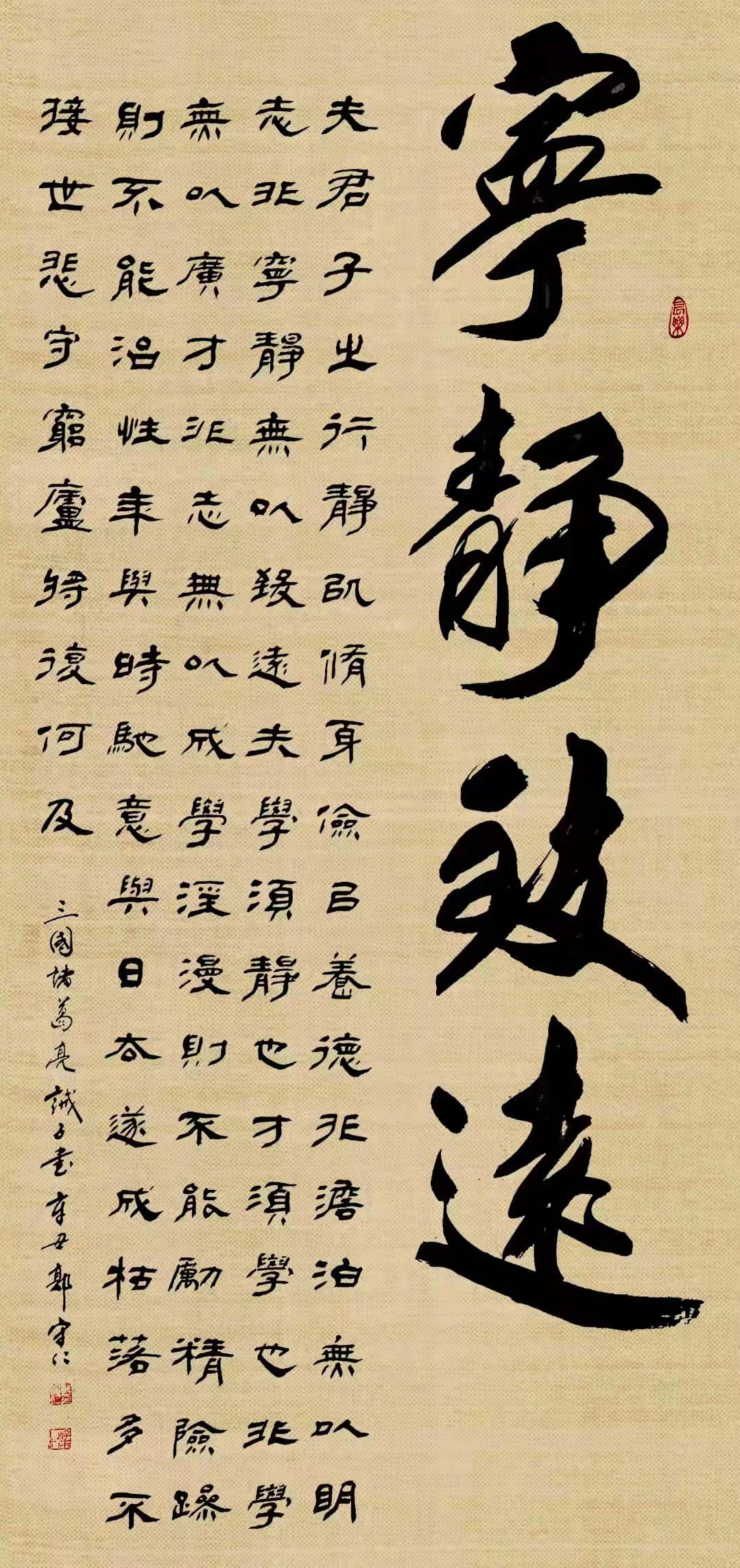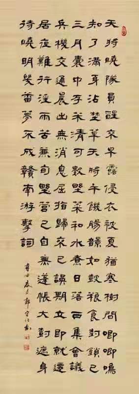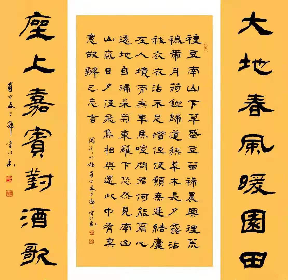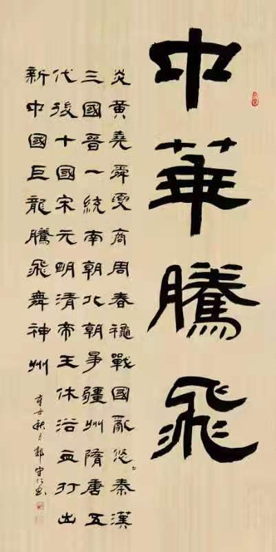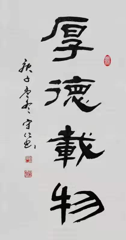 从书法艺术的表现形式来看,郭老师的作品多以隶书和行书作品见长, 细品其每幅作品都能展现他积淀的书法功力与自悟创新力。其笔法在汲取众家之长的基础上,又融入了自己几十年的军旅生活所带来的人生感悟与生活志趣。细细品味郭老师作品, 可体会到他笔法挥洒自如 ,亦如人生畅快洒脱 , 其书法作品布局严谨而不失格调与志趣,行笔转锋之间松弛有度,不拘一格。同时郭老师的作品中往往带着磅礴雄伟的军人气概 , 在细节之处又流露出文人所特有的清新气质。特别是他的隶书结构严谨而不呆板 , 雄健却不失洒脱 , 流畅之余亦透露出规整的法度 , 在其书法作品中拙与巧,柔与刚得以实现完美的结合 , 的确是美哉妙矣!