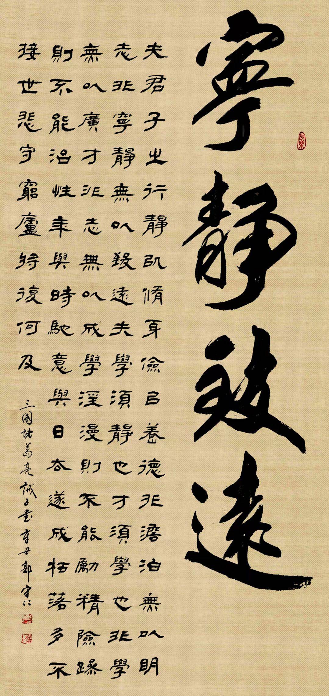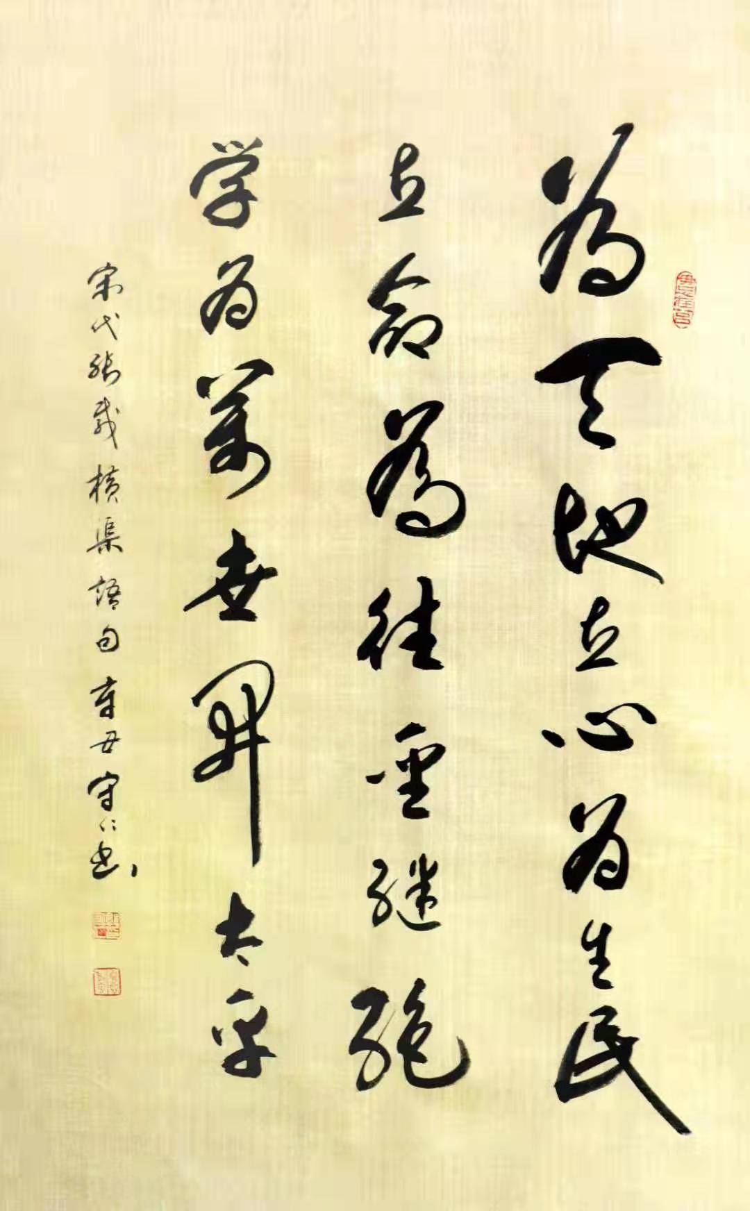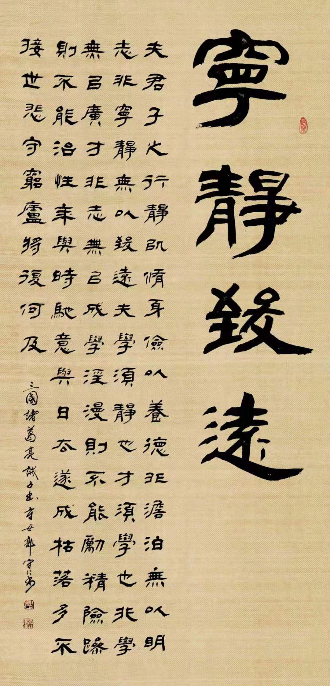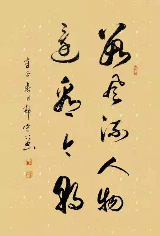 创作一幅作品,要调动自己已有的一切知识储备,联系最新技法精雕细刻,以求创作出记得住、留得住、传得开的书法作品。但是,如果没有厚实的传统文化底蕴,研习书法就是无源之水、无根之木。郭老师本就是研修中文的,可谓也是国学科班出身,在几十年的艺术追求生涯中,他系统学了中华优秀文化传统经典,诸如《中国书法史》、《王羲之传论》、《书法雅言》、《论书表》、《隶书体》、《承晋斋积闻录》、《古今法帖论》、《评书帖》等贴学经典著作,这也是一般人难以达到的治学境界。从郭老师的身上,让我们领悟到冰冻三尺非一日之寒的真正含意。