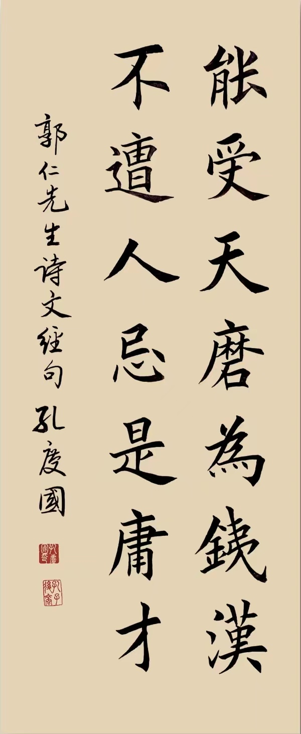 孔庆国,男,字望远,孔子第七十三世孙,1959年9月生,籍贯山东邹城,大专学历,中共党员,中国楹联学会会员,中国硬笔书法协会会员,中华志愿者书画院院士,中国书画家协会会员,中国老年书画学会理事,环球翰墨文化艺术院研究员,北京中艺燕京书画院会员,中国国画院书法院高级书法师,环球翰墨艺术院书法院副院长,淮南市书法家协会会员,淮南市摄影家协会会员,一级书法师。