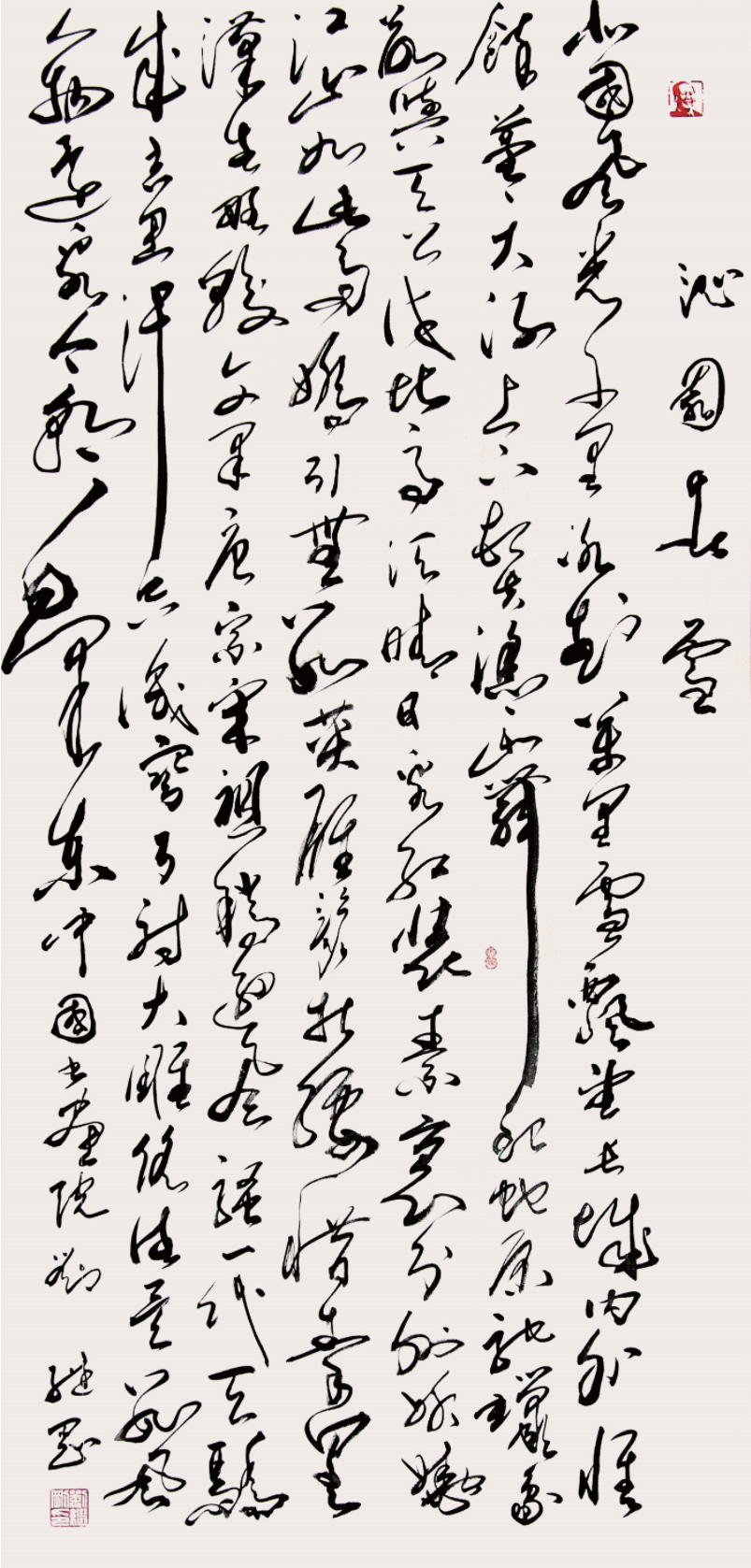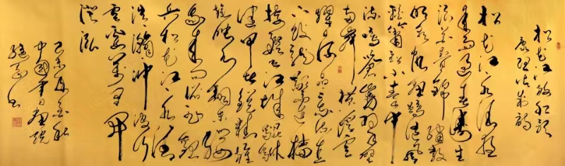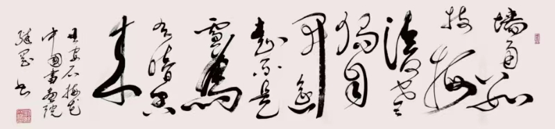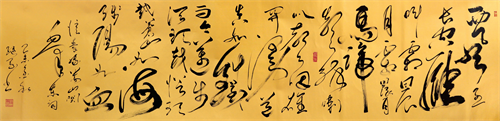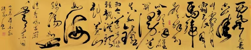 刘继刚先生的书法演变和艺术取向及取法可谓高明,转益多师、不染时弊、化古为我、功底深厚。他的草书不乏怀素之胎根,而张旭书风对其影响更甚。近年来,其遍临张旭各法帖,从其所书《沁园春·雪》可以看出,其草书已经臻于出神入化的地步,更显张旭书风的渗透,运笔跌宕利落、线条波澜起伏、结体奇伟拙崛、墨色酣畅淋漓、造势奇险峻严,给人一种“时而激越,时而悠扬,时而跳荡,时而轻慢”的音乐享受。怡人情怀,震撼人心。