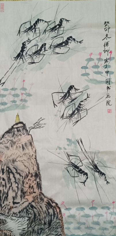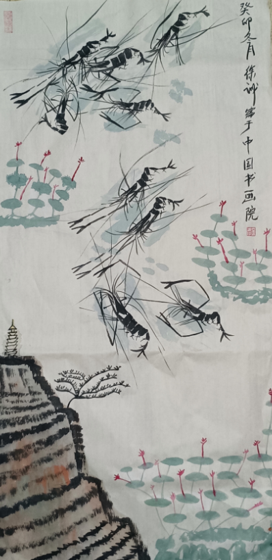 徐诚画虾,跟据活虾的生活,动态,画出一种充满活力、富有生命感的形态,具有很强的装饰性和审美功能。 徐诚对虾画颜色浓郁,充满鲜活感。他的虾画以白、黑为主色调,互相交织,变幻莫测,凸显出虾的柔软、多变的特质, 并且他的虾画呈现出粗短、简练的笔触,有时候略带颤抖,这种笔触造成了一种有趣且生动的效果,让虾的形态更加凸显出来,极富动感,画中伴有水草,菏叶,菏花,弥漫出中国传统文化的氛围。