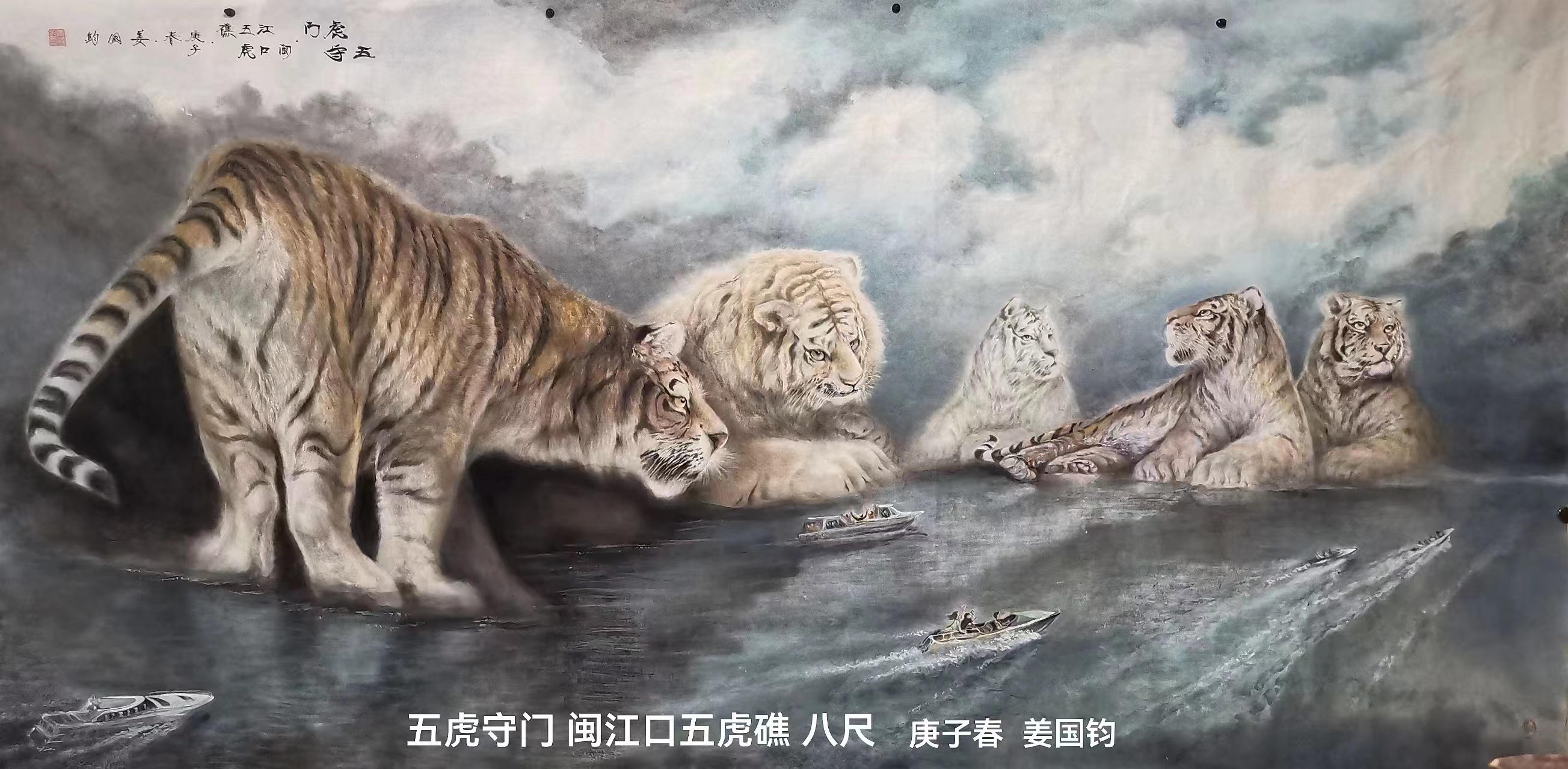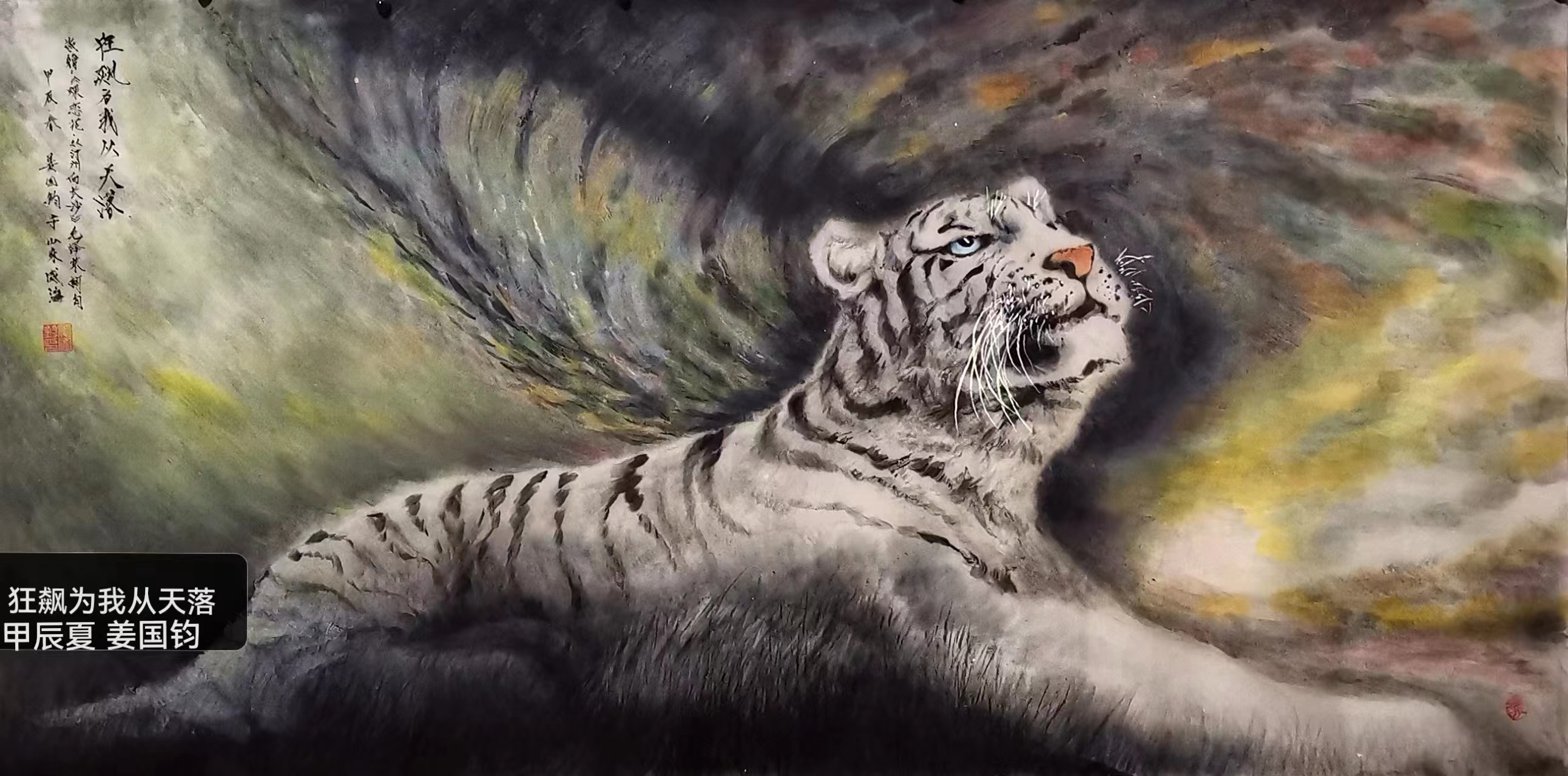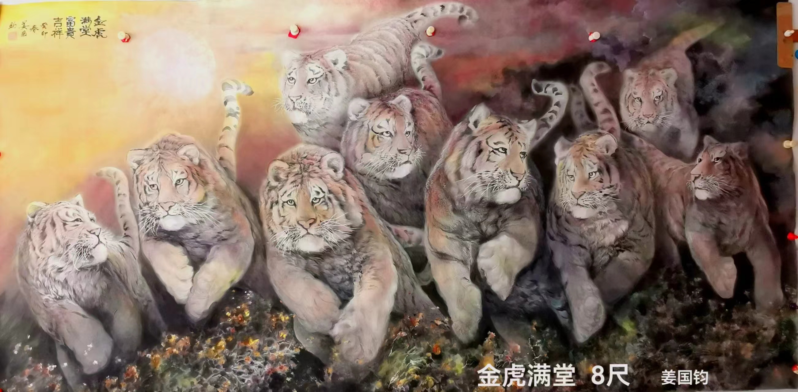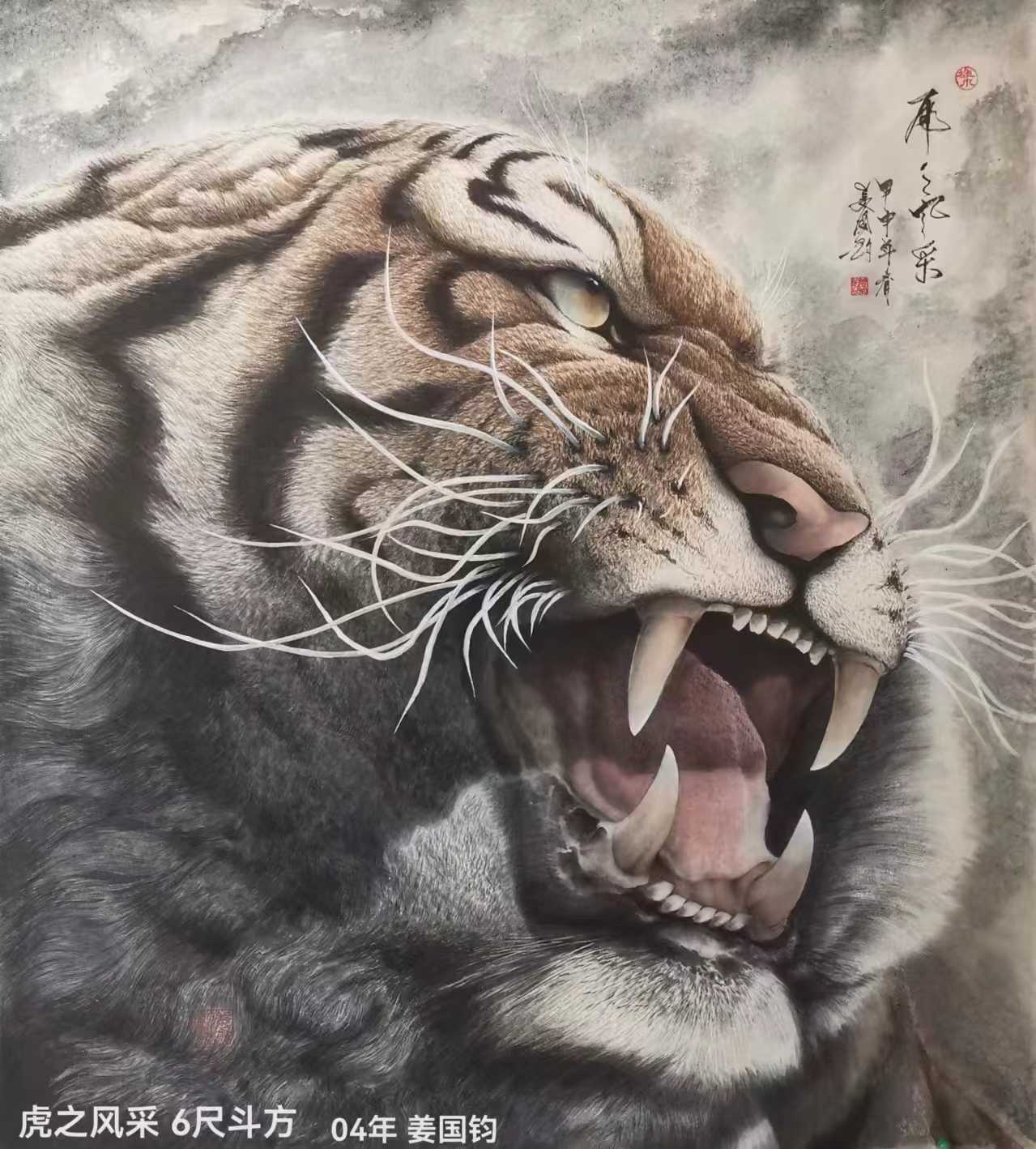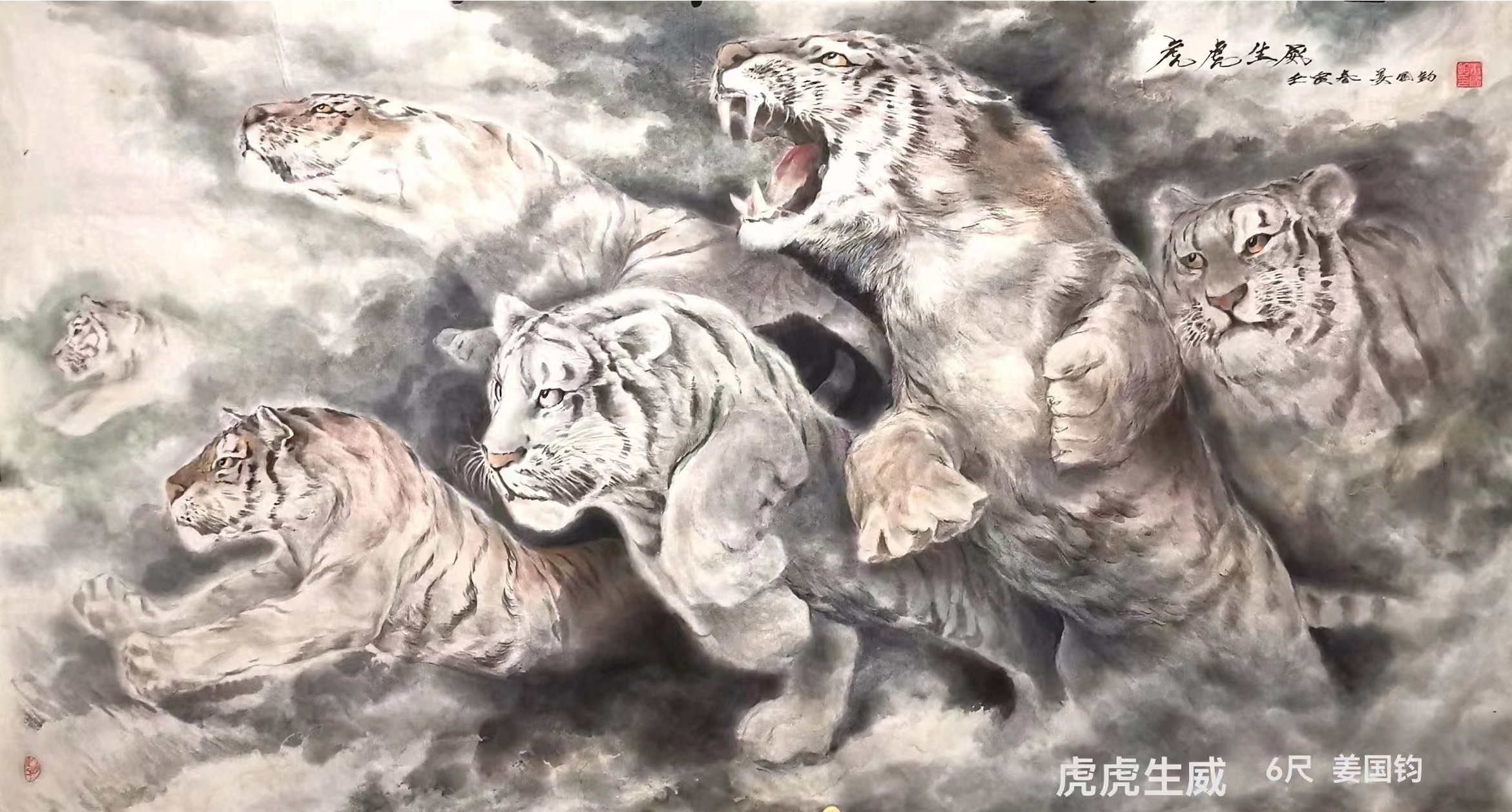 姜国钧:1947年生人,大学学历,笔名,画虎者,山之子,字”虎缘”。63年作品“小司机”获奖后至今画画61年,73年路遇东北虎后画虎约51年。主要国画工笔、水墨徬及水彩、油画。国家一级美术师,国宾礼特供艺术家,中央美院客座教授,中央电视台艺术导师,北京华夏兰亭书画院院士,世界侨联总会艺委会理事,清华美院驿站特聘画家,威海经区老年书画家协会主席,威海市老年大学教师。