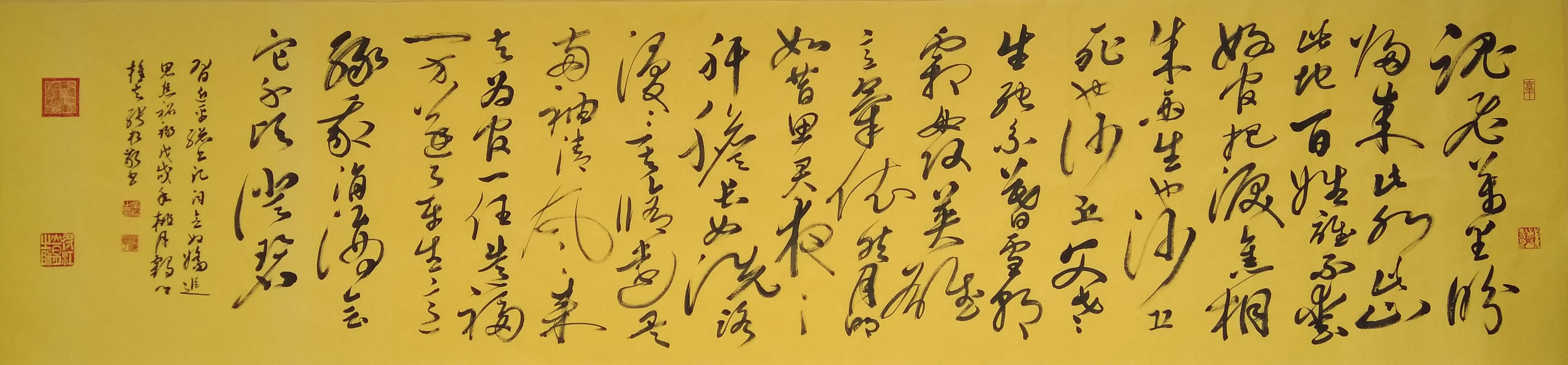 张松,男,汉族,1949年6月生,江苏盐城射阳人, 字南山,号鹤乡樵夫、沧海艺人等,斋名松梅草堂,大学学历,中国书法家协会会员、中央电视台艺术导师、清华大学美术学院美术系客座教授、法兰西皇家美术学院艺术学博士、法兰西皇家画院外籍院士、国家一级书法家、国家一级艺术家。荣获世界非物质文化遗产传承人物、联合国非遗传承人、中国书画非物质文化遗产功勋人物、国务院国宾礼特供推荐艺术家、国礼艺术家、百年巨匠·十大宗师、国粹传承巨匠·草书一代宗师、民族国粹20名顶级艺术大师、当代最具影响力书法大师、感动世界年度人物、世界文艺功勋人物、世界最美艺术大师、感动中国·最美艺术家、中国新长城杰出艺术家、中国红色文化功勋人物、亚洲艺术风云人物、联合国中华文化传播大使、世界殿堂级艺术大师等荣誉称号。荣获中华人民共和国建设成就金奖、“中国艺术华表奖”金奖、国家巨星、中国航天艺术科普大使、一带一路文化之旅国礼艺术家、第十一届中国文化艺术节“金兔奖·终身成就奖”、法国艺术及文学骑士勋章、亚洲艺术樱花奖、联合国非遗贡献奖、国际文艺界联合会最高荣誉奖“国际艺苑金圣奖”等。