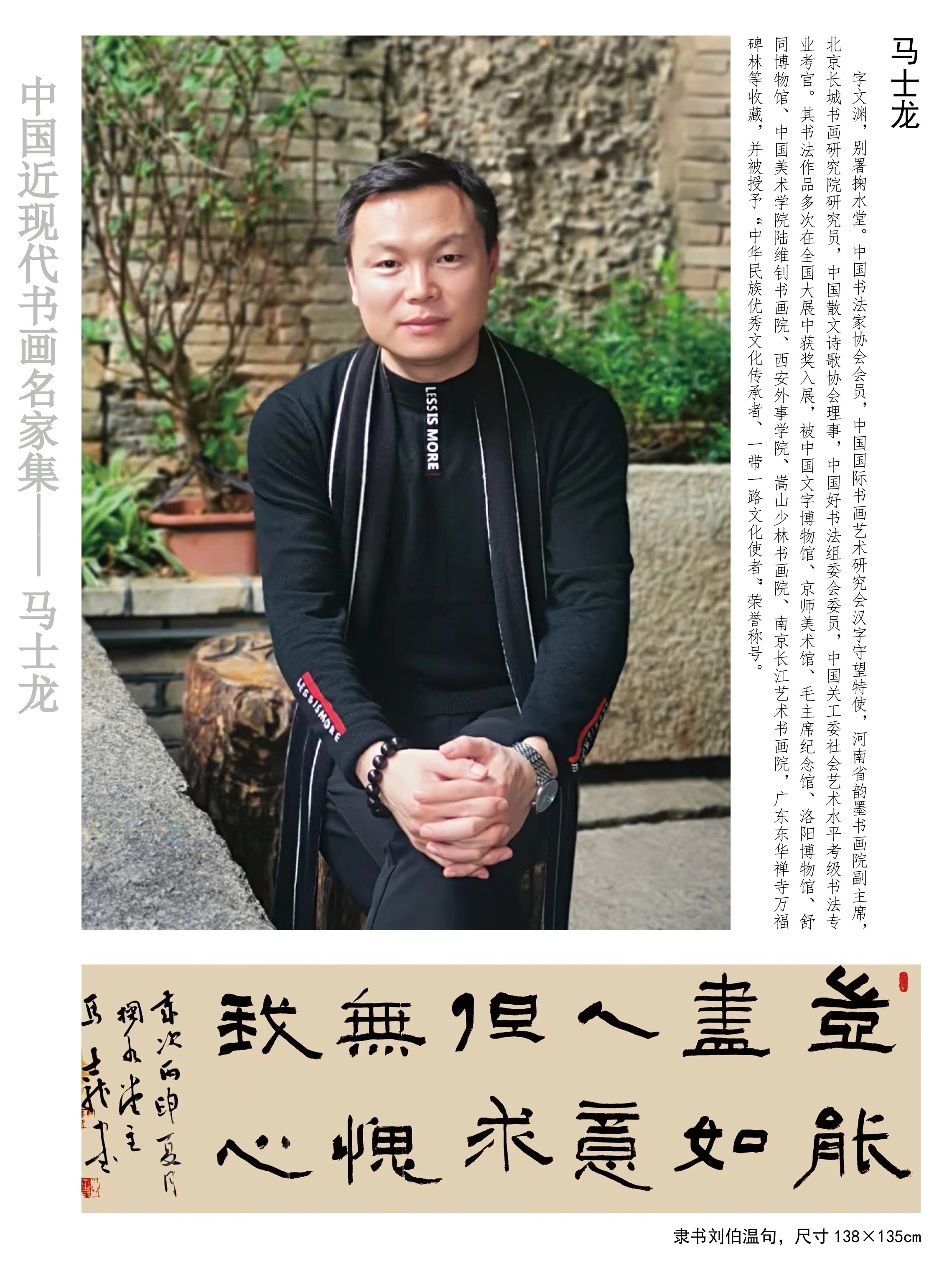 马士龙,字文渊,别署掬水堂,慧龙经典教育学校创办人。中国书法家协会会员,中国甲骨文艺术研究会会员,河南省韵墨书画院副主席,长城书画研究院研究员,中国散文诗歌协会理事,中国好书法组委会委员,中国关工委社会艺术水平考级书法专业考官。近几年其书法作品多次在全国大展中获奖入展,被中国文字博物馆、京师美术馆、毛主席纪念馆、洛阳博物馆、舒同博物馆、中国美术学院陆维钊书画院、西安外事学院、嵩山少林书画院、南京长江艺术书画院,广东东华禅寺万福碑林等收藏,并被授予“中华民族优秀文化传承者、一带一路文化使者”荣誉称号。