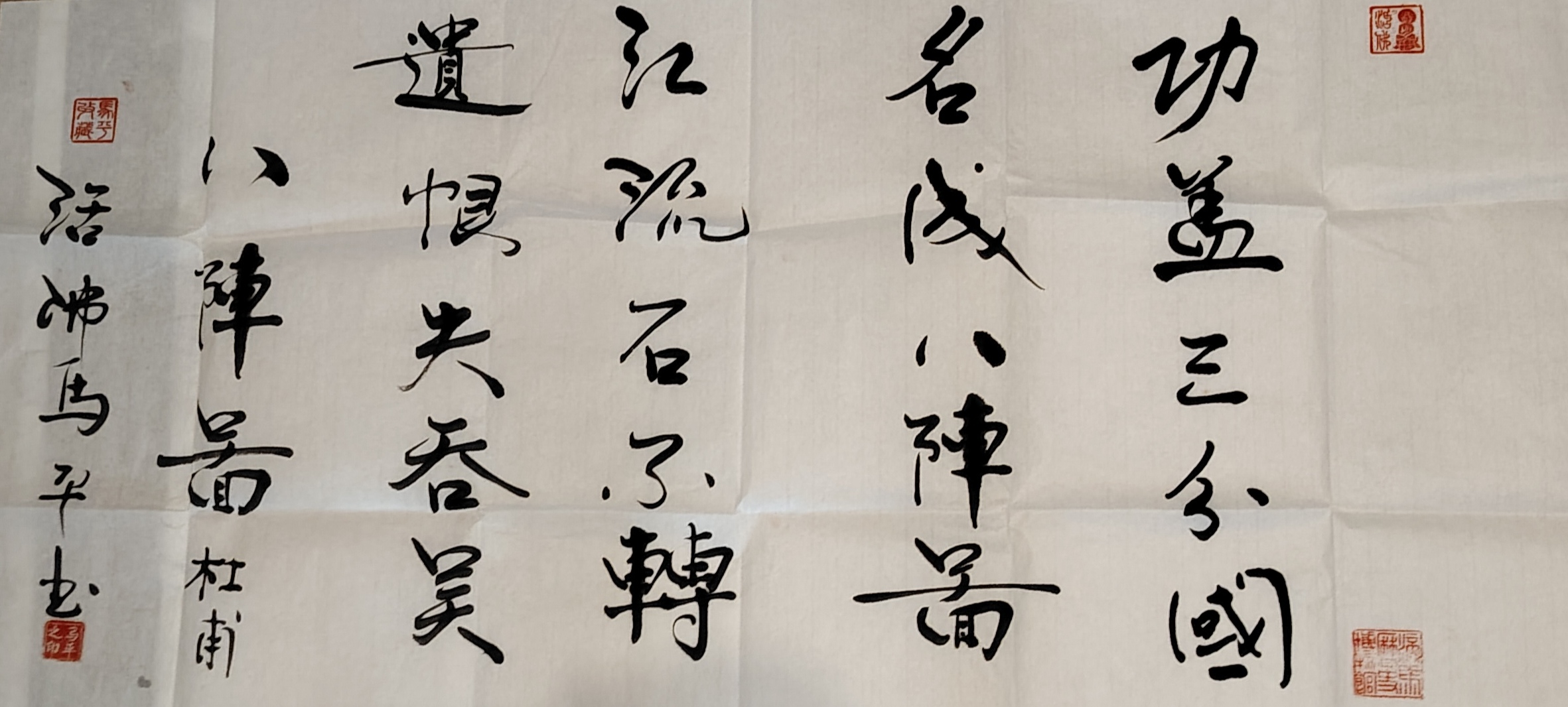 马老师的书法作品,行笔流畅自然,笔画有轻重变化,字与字呼应连贯,展现出对行书笔法的较好把握,布局疏密得当,以榜书呈现,墨色厚重,笔画雄浑大气;小楷作品,字体规整精致,笔画细腻精准,体现出作者小楷功底,整体布局严谨。