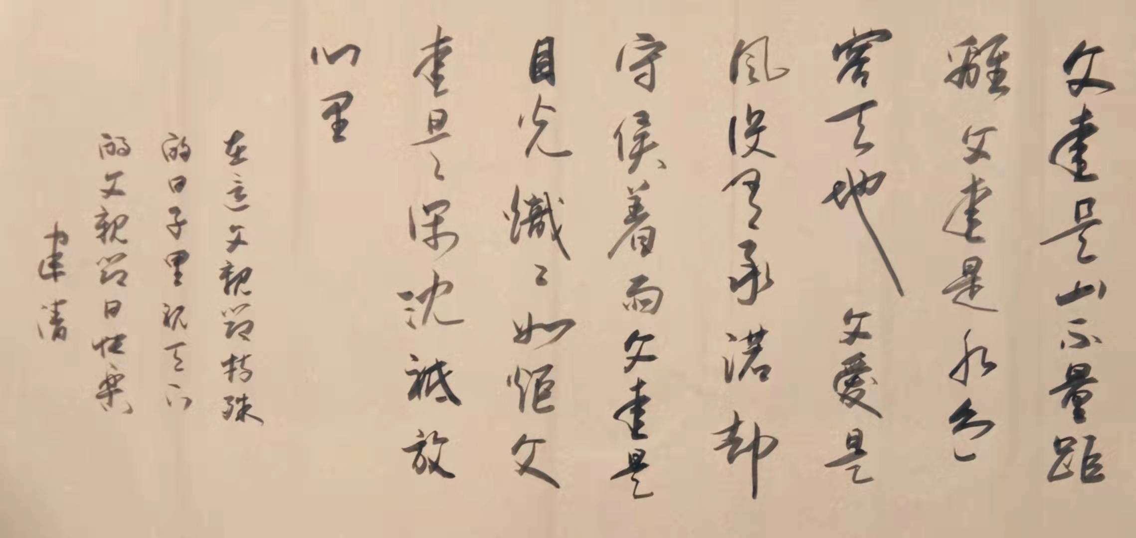 叶建清的草书在结构上做到“有常理,无定法”,他在书写中用笔的圆转、方折、连带、割断、轻重、提按等对立因素在起笔、收笔、运笔过程中做到了因时而变,因势而变。心、身、手、笔融为一体,笔触变化莫测,俨然一派大自由、大自在的境界。在结构与章法方面注重了字与字之间的大小错落、左右穿插、上下移位等,使字势有一种虚活灵动,生机盎然的运动感。